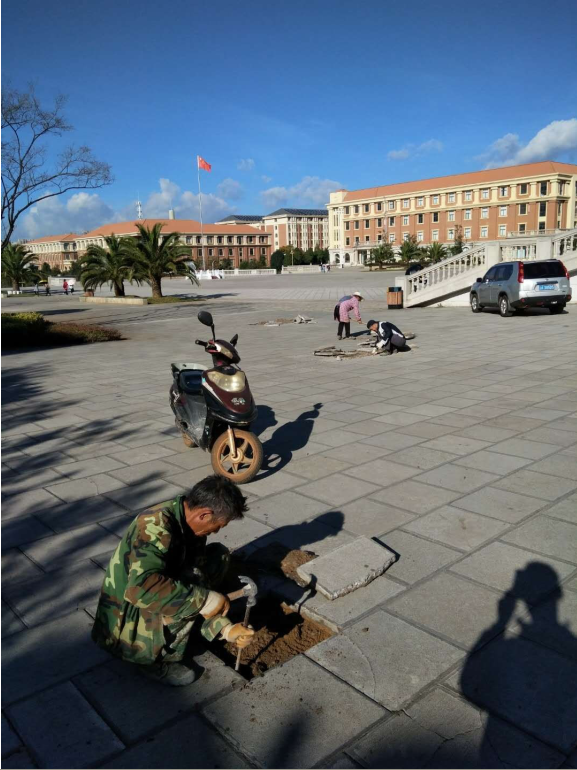 呈贡校区北门广场和文典广场为青石板铺路,多年来由于汽车碾压,多处出现石板断裂、沉降现象,既影响美观,又存在安全隐患。物业中心用一周时间对呈贡校区青石板道路进行维护,更换破损青石板300余块,修复沉降区域20余处。